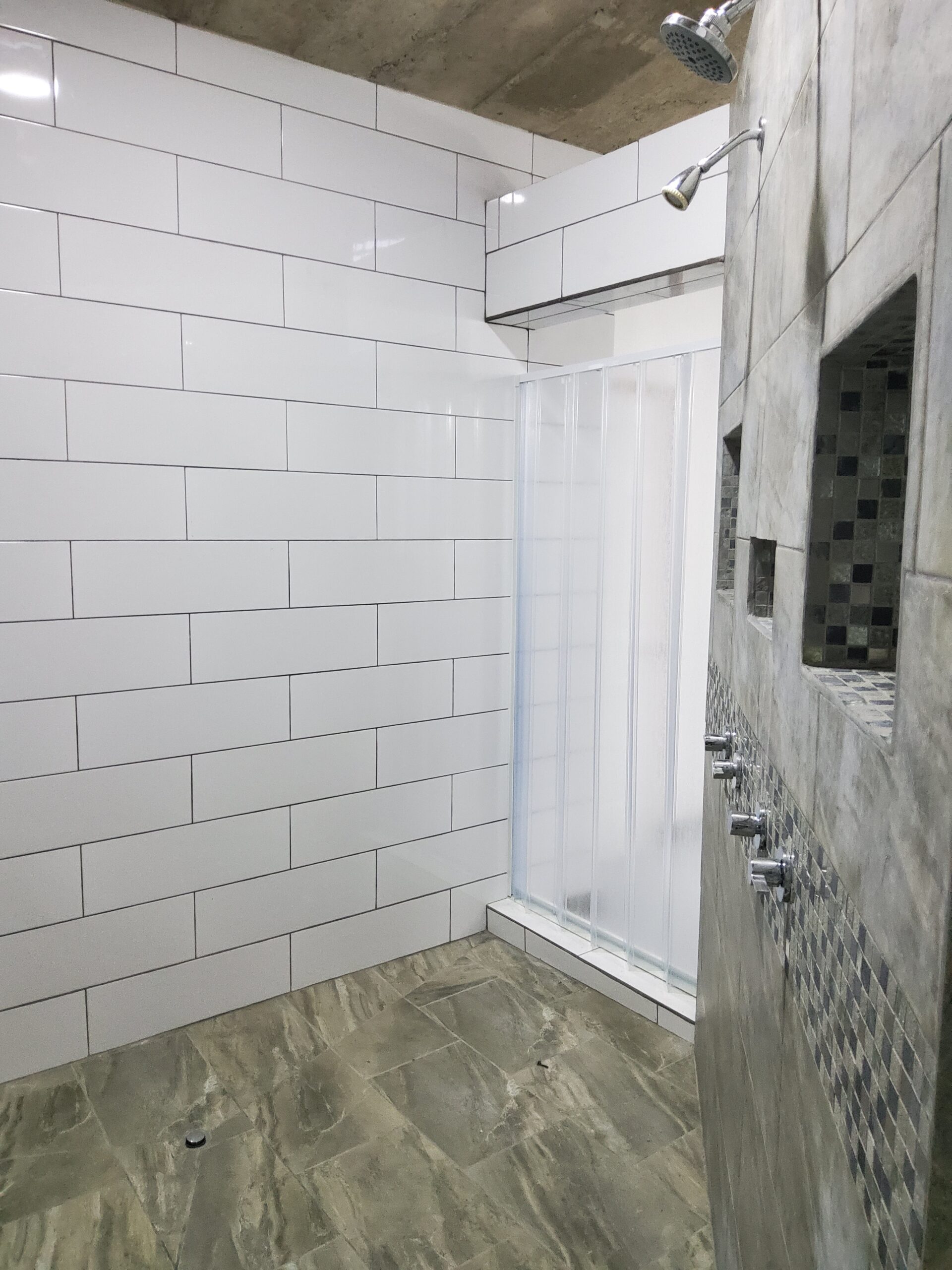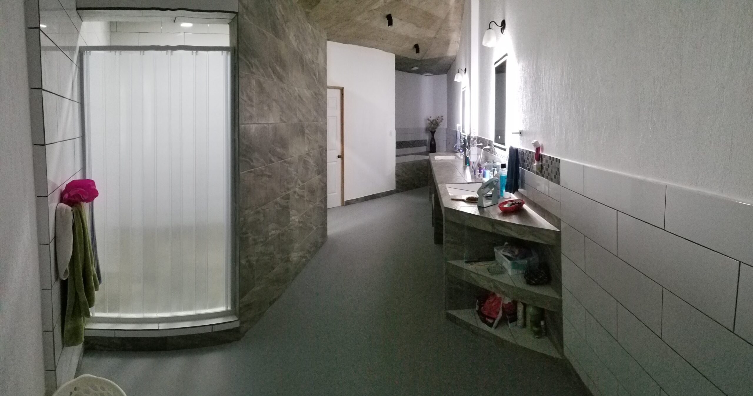 Galley style on-suite master bathroom that measures over 35′ at its longest point, double built-in concrete and tiled sinks with counters measuring over 25′ in length with lighted vanity mirrors. The shower measures 8’x8′ with double shower heads and double entry doors. Large 5.5′ tiled soaking tub The toilet area has its own space with a privacy door.