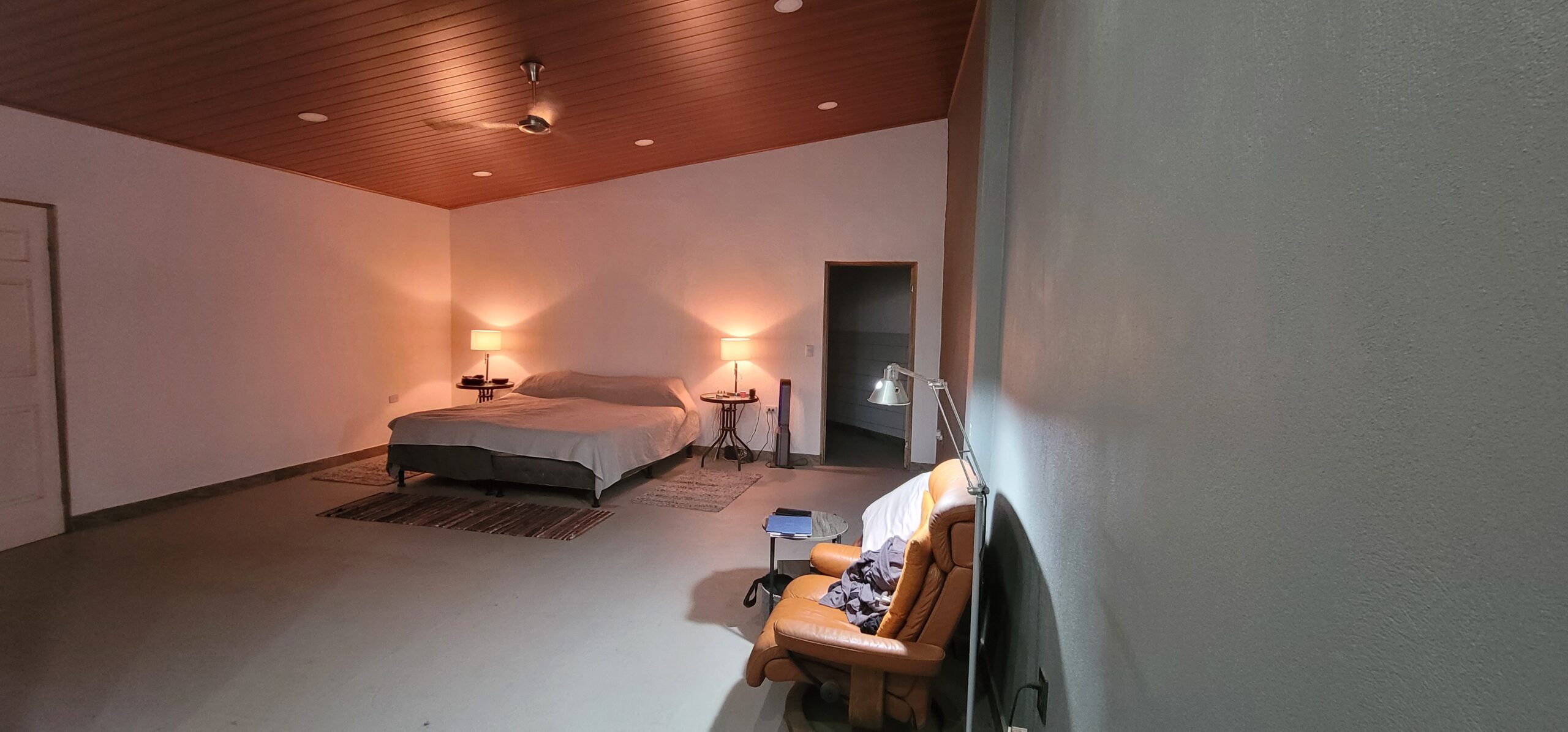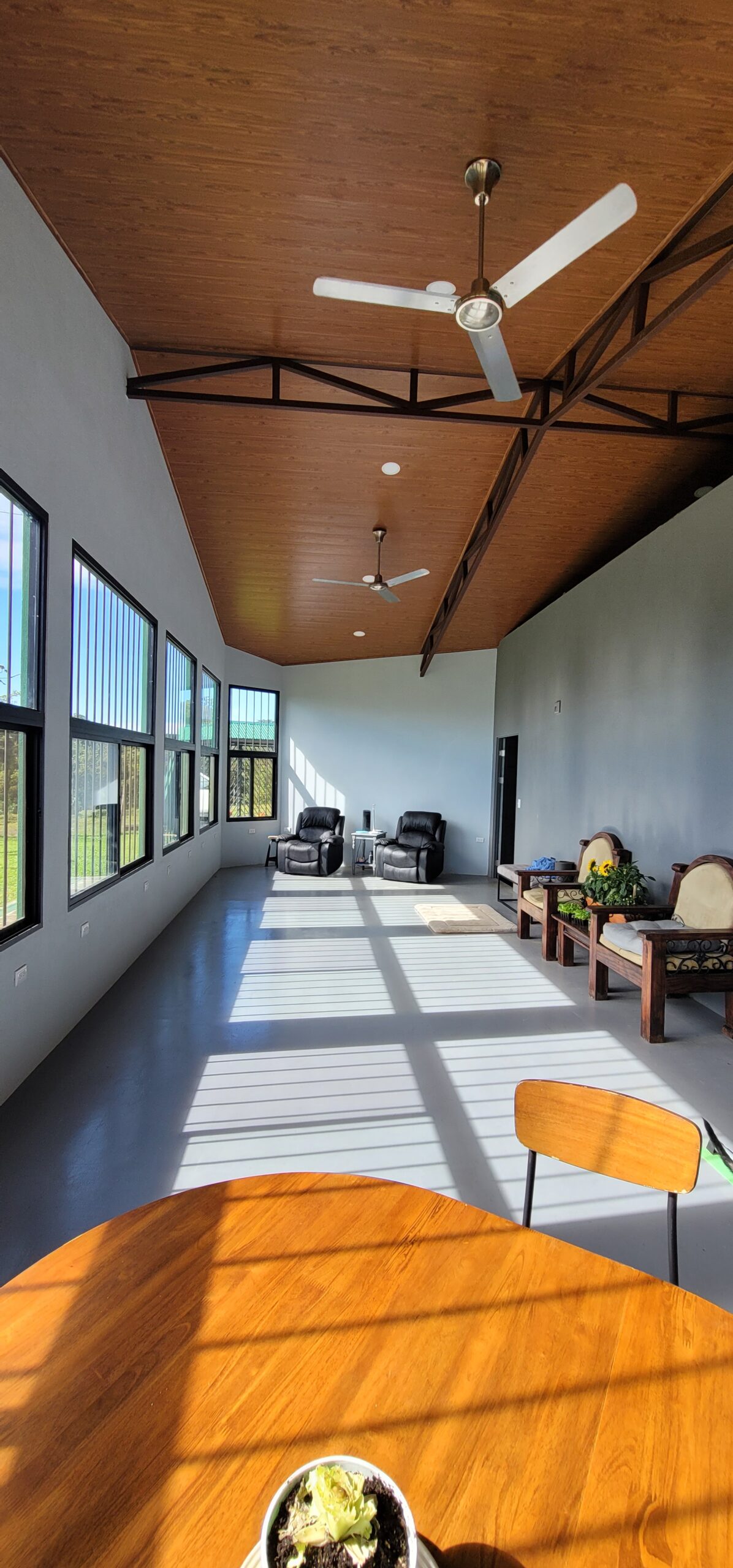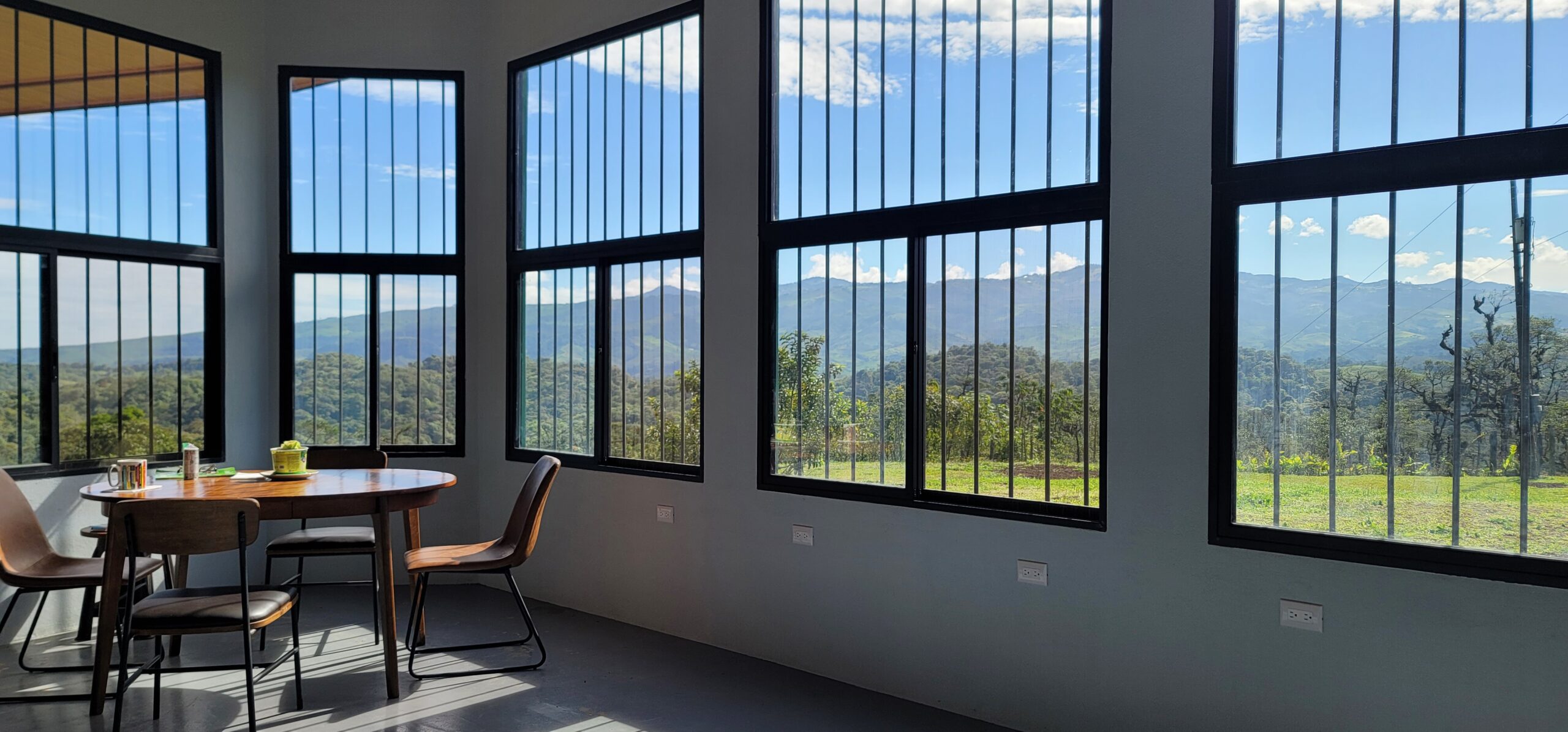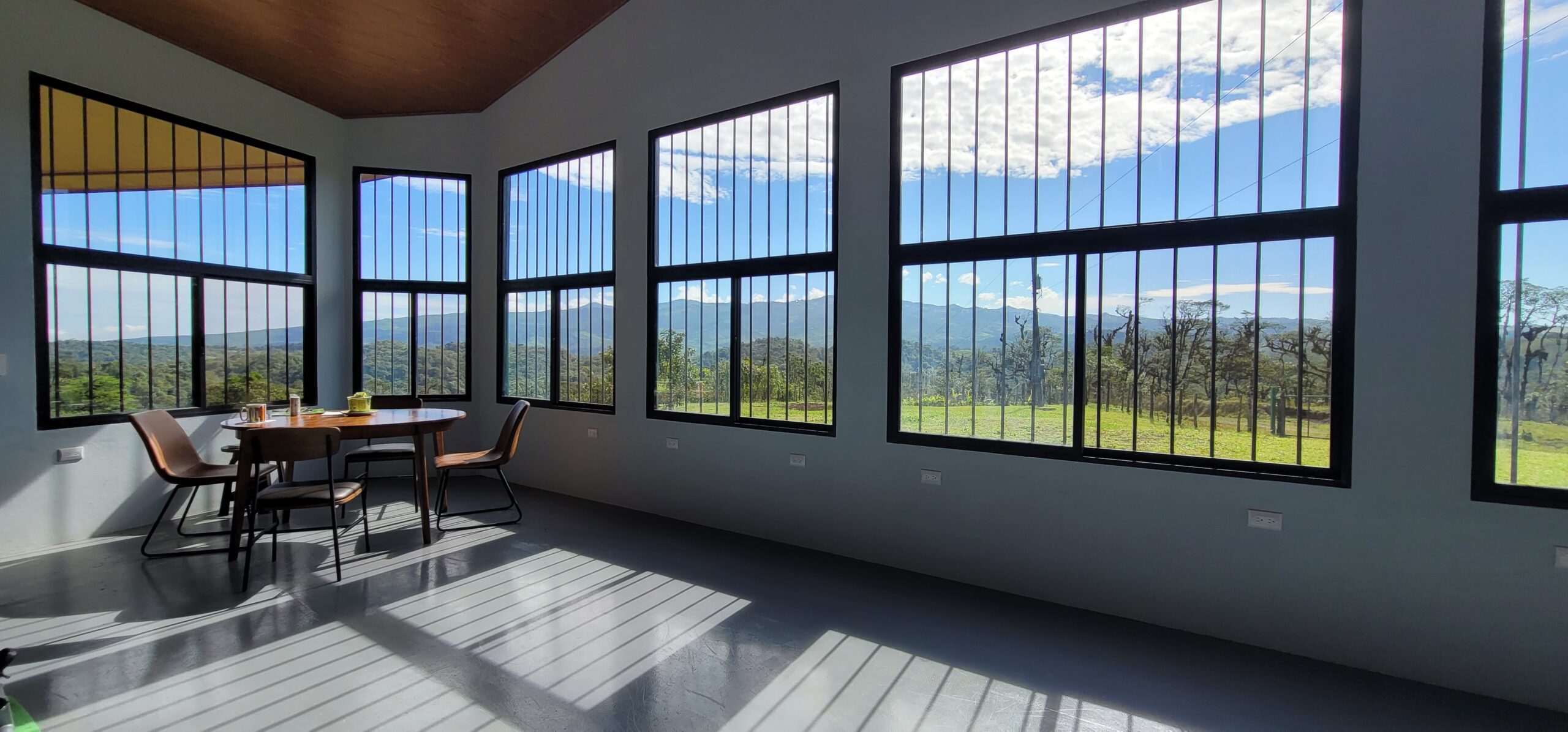 There is a 38’x13.5 foot long sunroom with high ceilings, eight large 7 foot tall windows with beautiful views of mountains, volcanos, tree canopy and world famous Villa Blanca resort. This room faces east/north east so the sunrise over the mountains is breathtaking.
