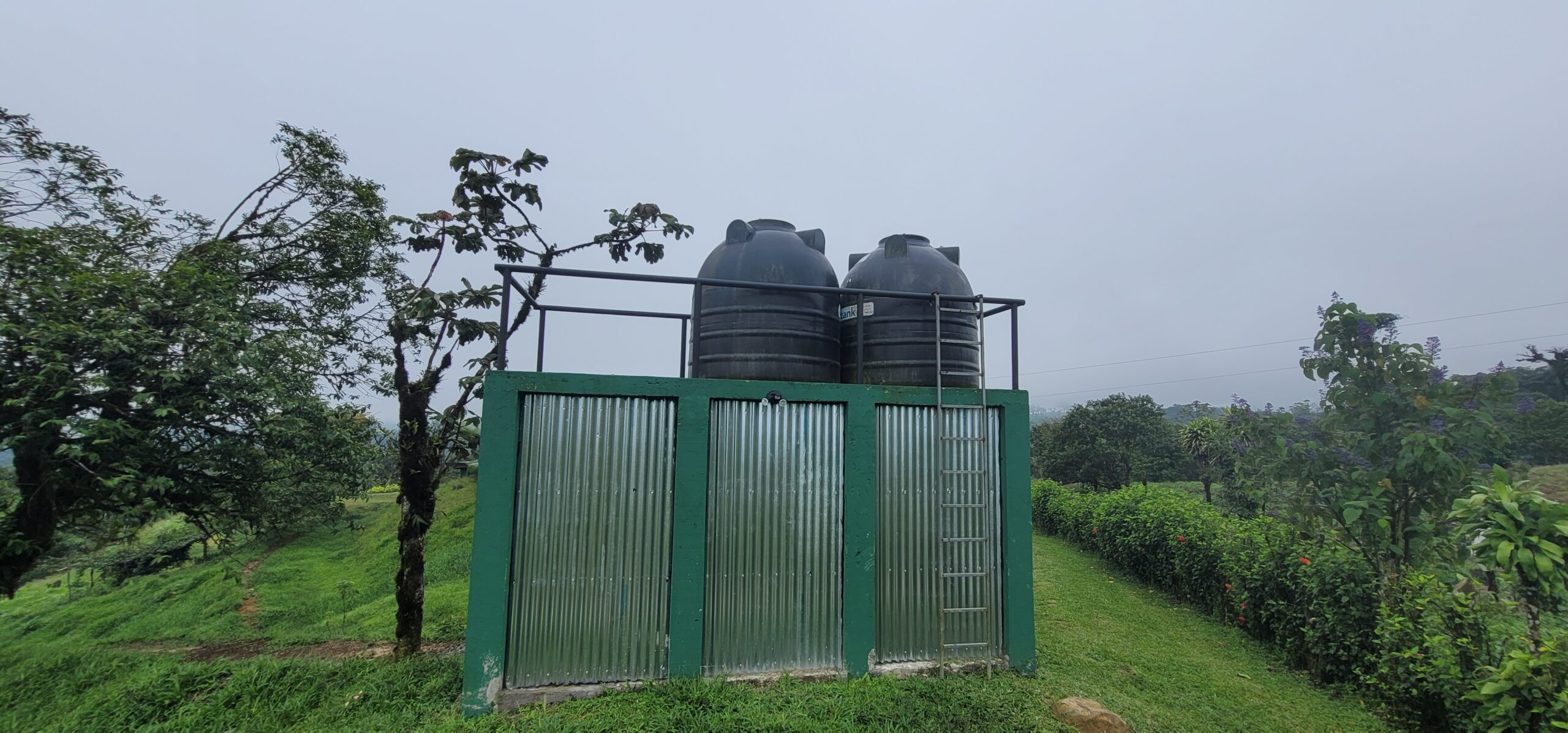 Behind the house is a concrete and metal storage shed that houses a newly installed water pump and pressure tank. Above the shed sits two 2500L / 660 gallon water tanks totaling 5000 liters or 1320 gallons.