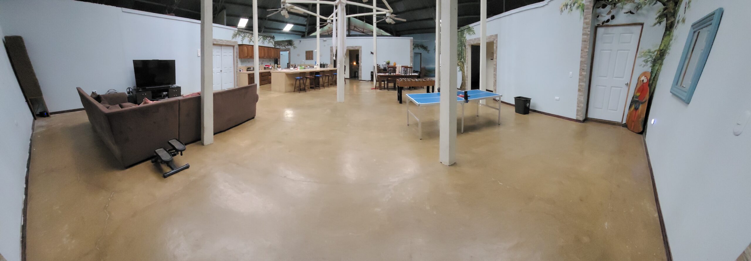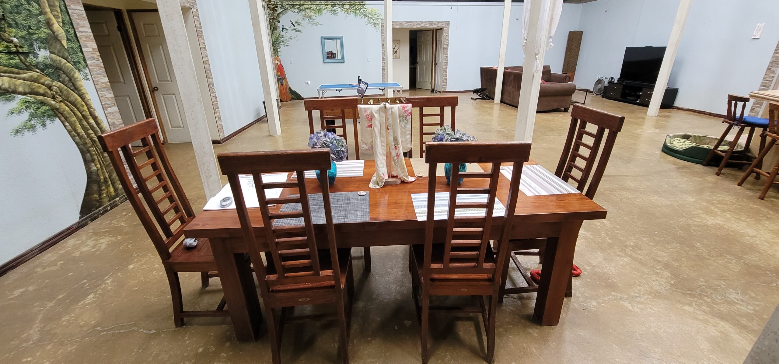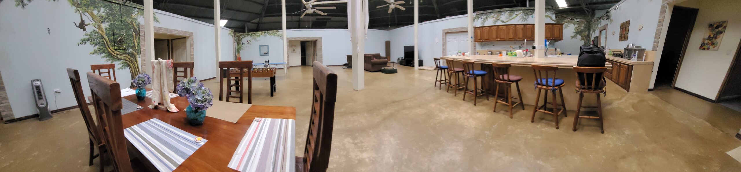 The center gathering area of the main house is 42×35 feet around and has an octagon shaped vaulted ceiling with 7 skylights , 4 lighted ceiling fans . beautiful large Costa Rican wood table for 8 people and large custom sectional sofa. This retreat has over 100 feet long by 12 ft high murals throughout the house done by an international landscape artist. Landscape Murals bring the cloud forest, mountains and wildlife into the house.