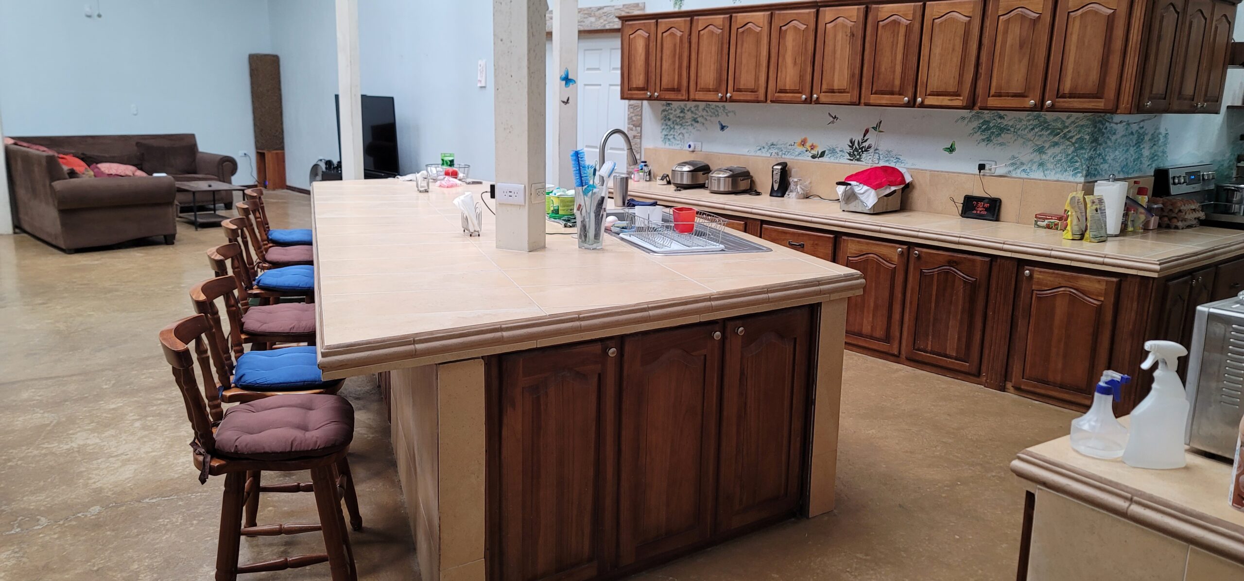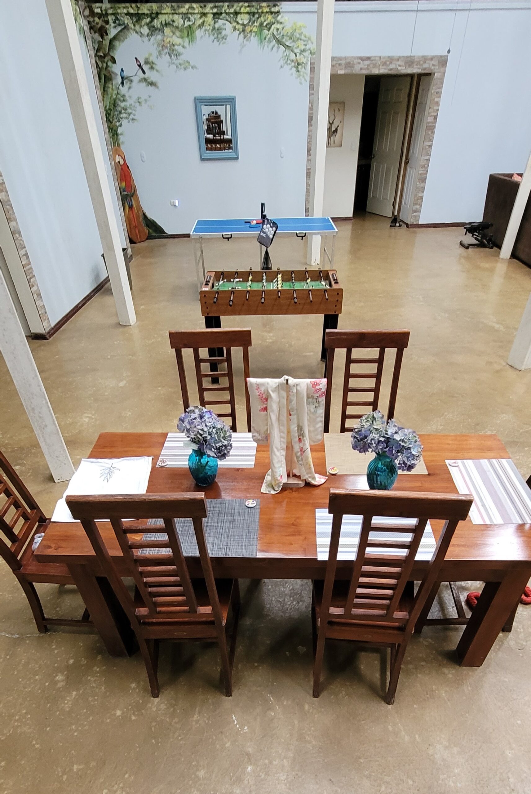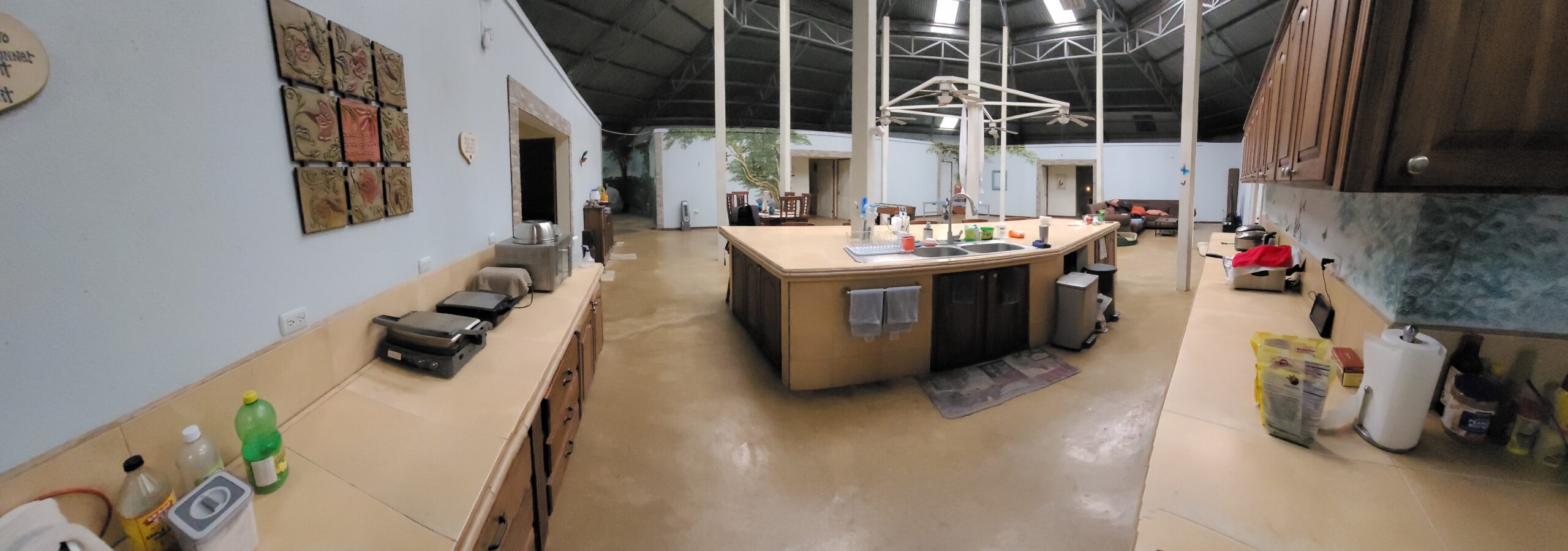 The center gathering area of the main house is 42×35 feet around and has an octagon shaped vaulted ceiling with 7 skylights , 4 lighted ceiling fans . beautiful large Costa Rican wood table for 8 people and large custom sectional sofa. This retreat has over 100 feet long by 12 ft high murals throughout the house done by an international landscape artist. Landscape Murals bring the cloud forest, mountains and wildlife into the house.