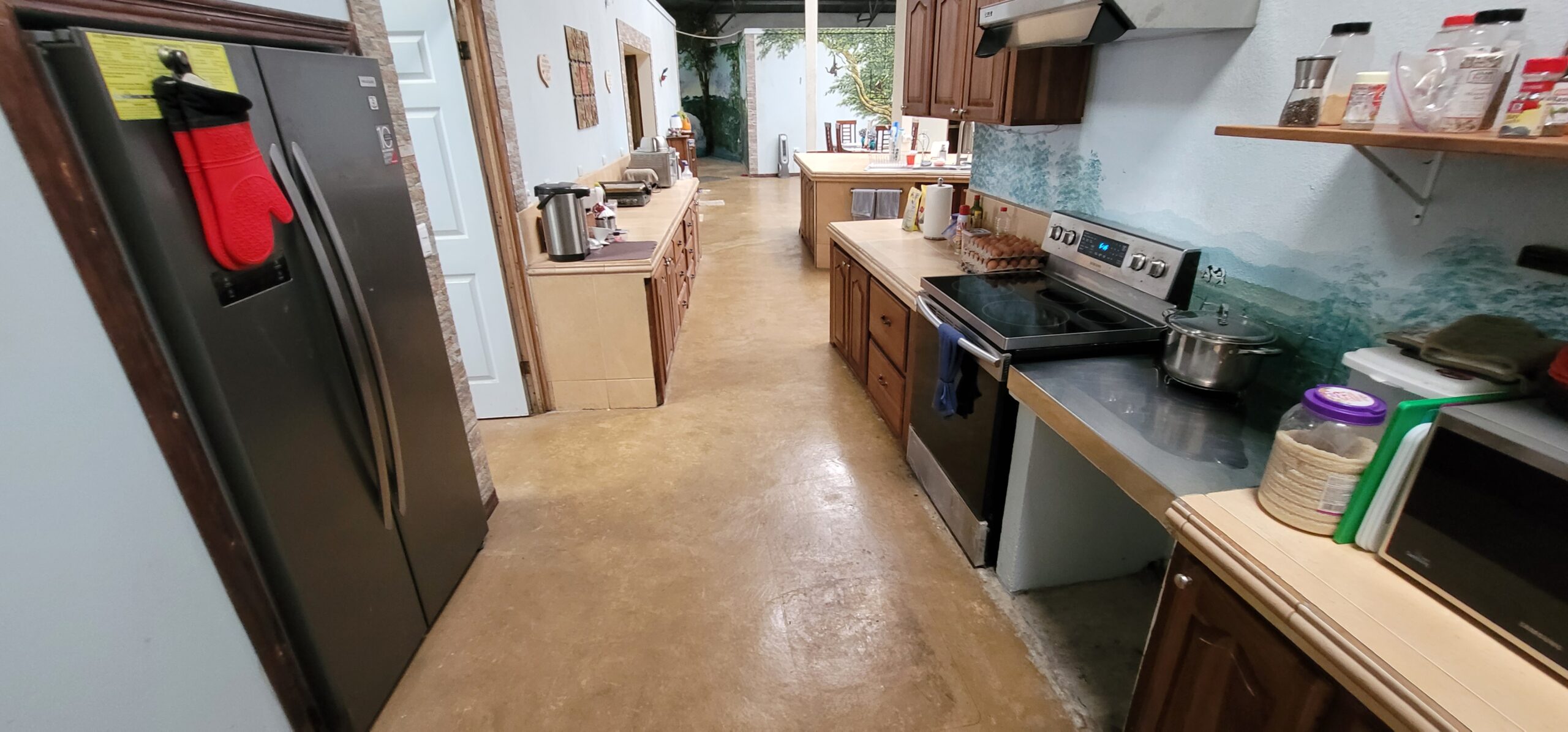 The kitchen is large and functional. The island is 12′ long and 5 feet wide. Plenty of storage and pantry space. Beautiful Costa Rican wood cabinets.