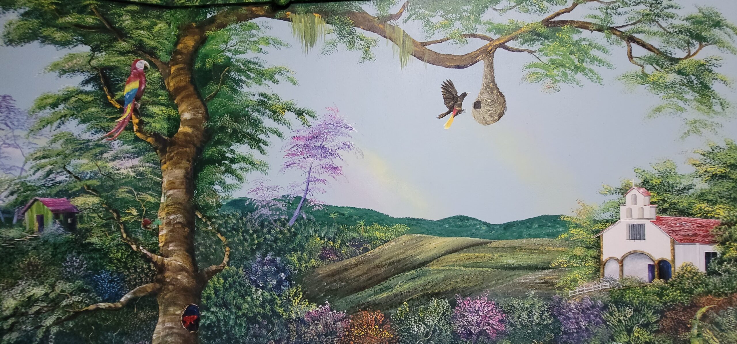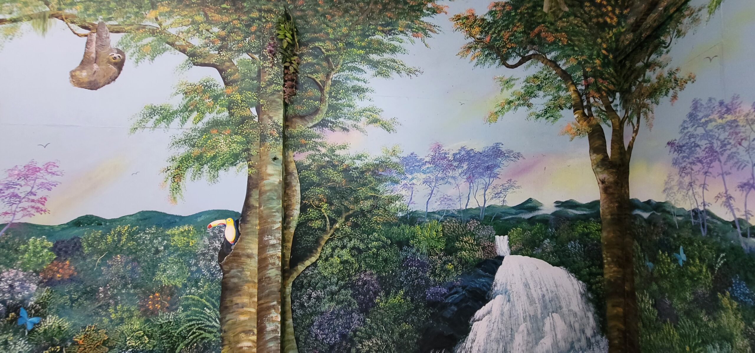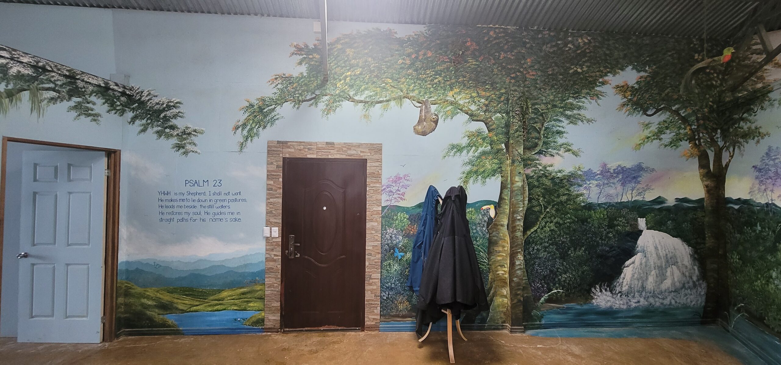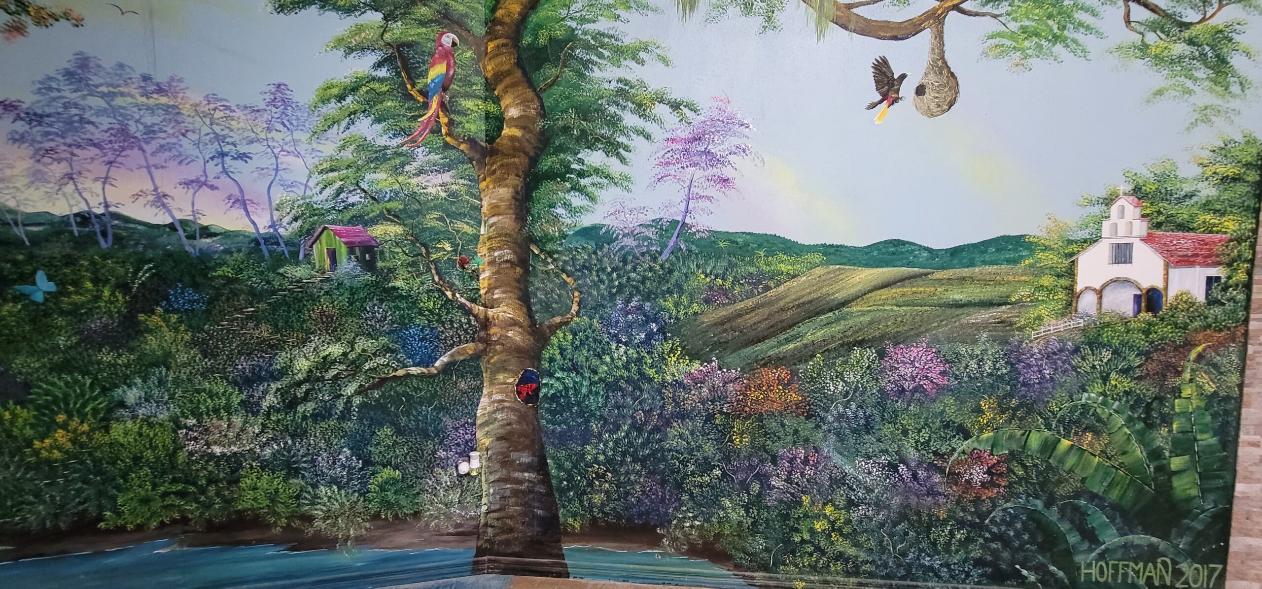 As you open the steel front door with a six point locking mechanism and walk into the large foyer, you are met with over 100 ft long by 12 ft tall landscape murals valued at over $12,000 of nature scenes located on this farm. The beautiful fine art landscape murals were done by international landscape artist Paul Hoffman. (He is available to do additional murals if desired). Murals are filled with scenes of waterfalls, rivers, trees with exotic birds, monkeys, orchids, sloths and a beautiful turn of the century chapel on a resort seen from this mountain. (See pictures below).