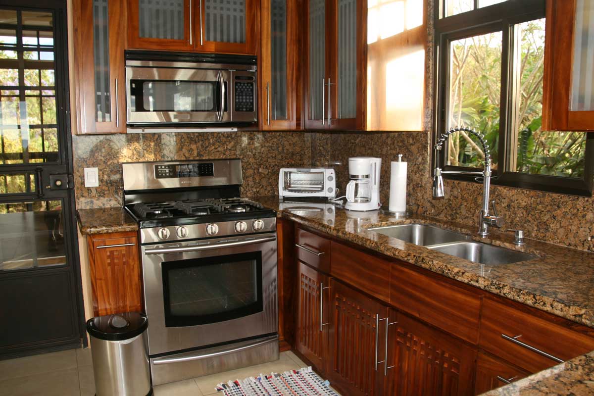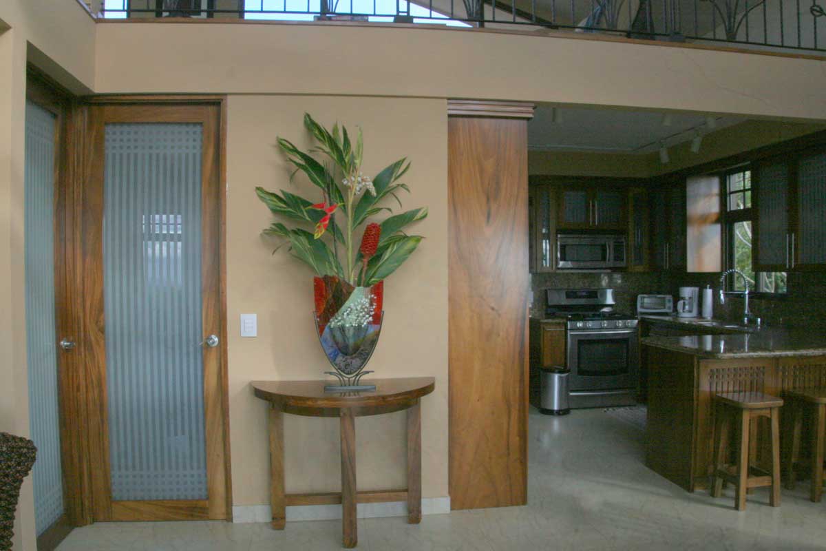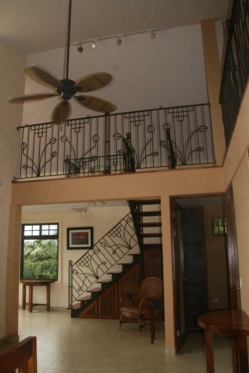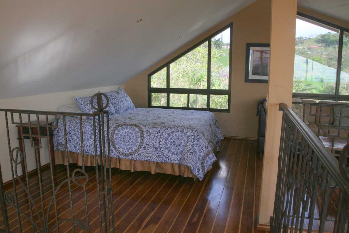 Casita Vivace is a separate 2-story, custom-designed house with 2000 square feet, plus front and rear patios and second story balcony, all with fabulous views. The impressive custom iron work surrounds the balcony and interior loft. Custom woodwork is throughout the ground floor and master queen bedroom, loft area with family room plus queen bed and sofa bed, bath with both outdoor and indoor showers, kitchen, dining/living room, and laundry. The spacious gourmet kitchen is a delight to anyone who enjoys cooking. The bathroom is unique with stonework bathtub and shower, and a second beautiful outdoor shower. The house is fully furnished inside and out, and all utilities, reliable high-speed internet, and private parking are included. A hearty breakfast can be served at the main Hacienda at an additional cost, with fresh local fruit and juices, homemade pastry, granola and local coffee, followed by a main breakfast dish.