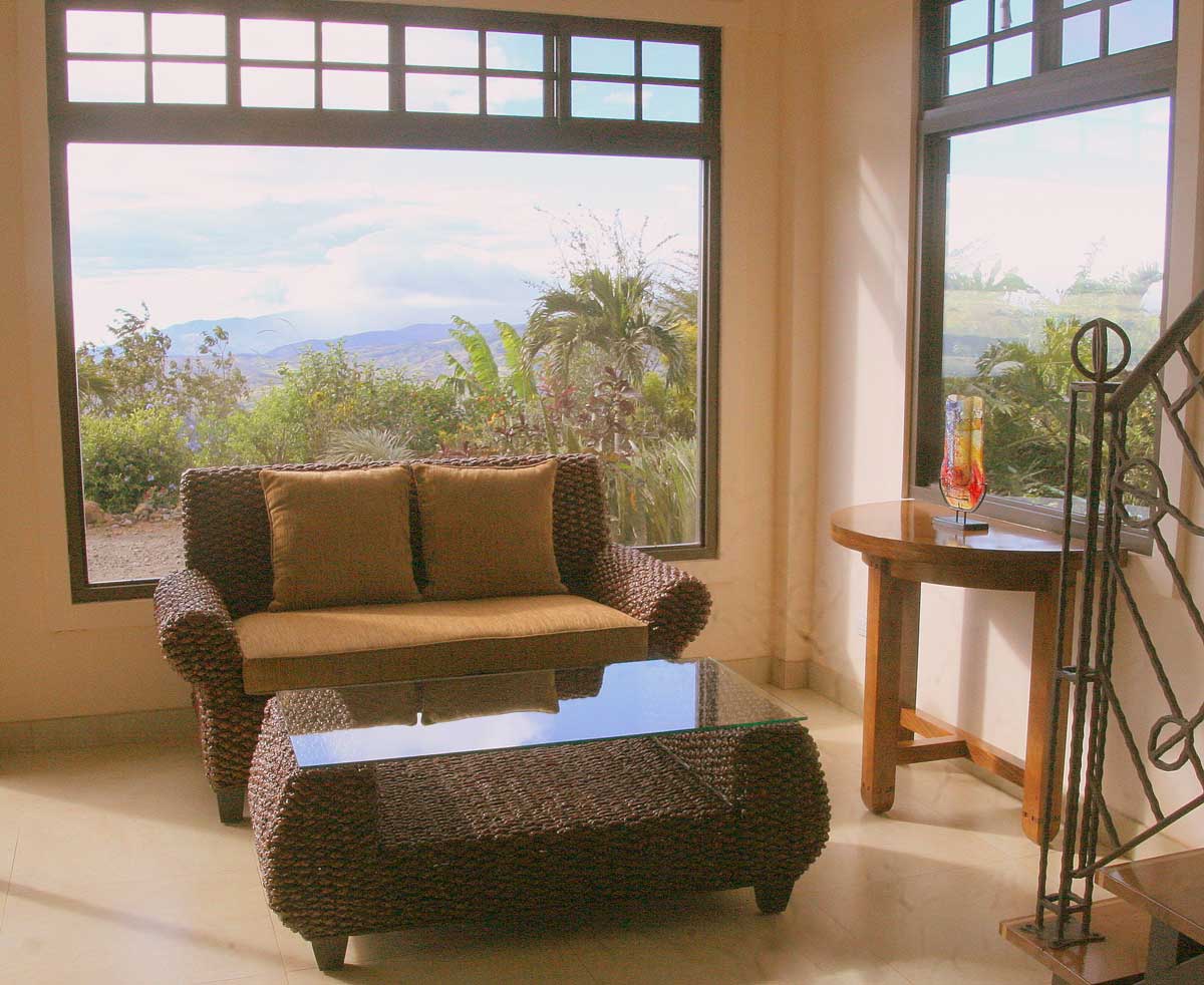 STUNNING VIEWS AND WORKING COFFEE PLANTATION. The property has spectacular views all around. At 3700 feet and a constant temperature in the mid-70’s, the Hacienda and Casita Vivace overlook the Pacific Ocean and the Bay of Nicoya with its many islands. Visitors watch the cruise ships enter the port of Puntarenas, and enjoy phenomenal sunsets and dazzling evening lights. The surrounding mountains display lush semi-tropical vegetation. The working coffee plantation is flocked with the dramatic white coffee flowers in May and the cherry red coffee berries in November through January. The Hacienda gardens are tenderly cared for by the owners and provide an ambiance of beauty and tranquility.