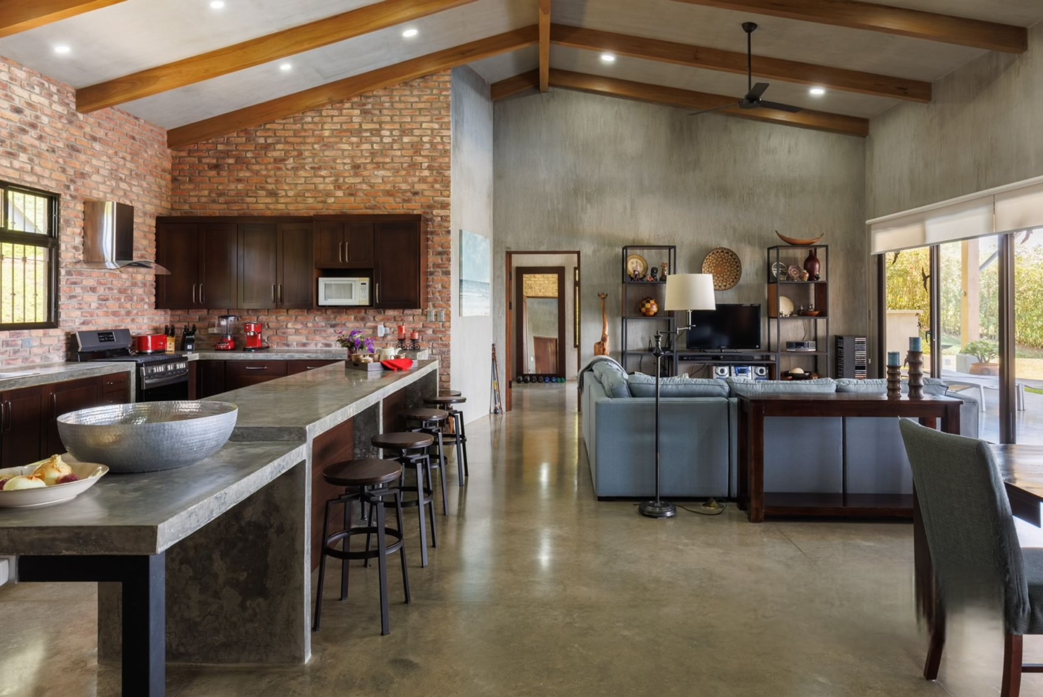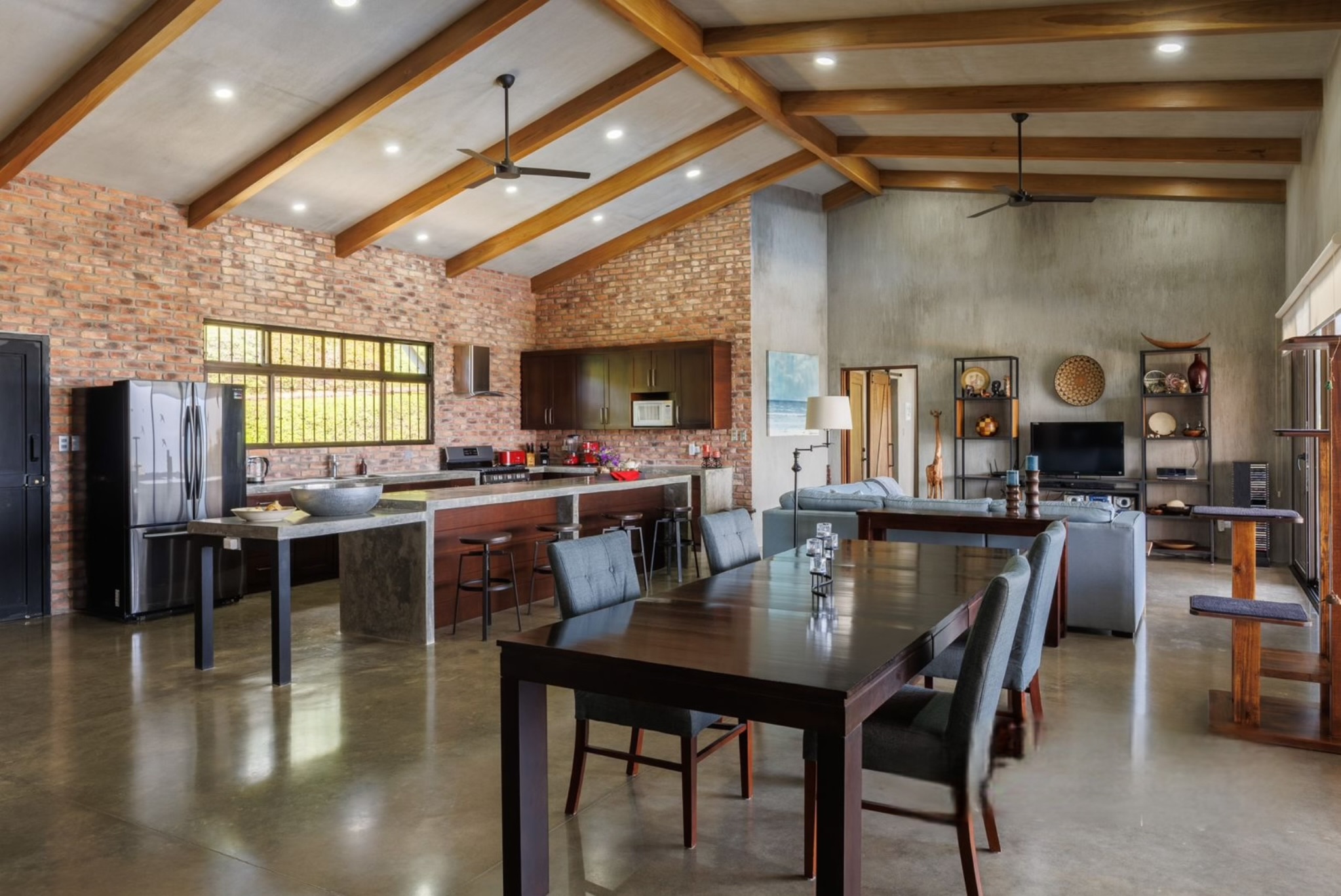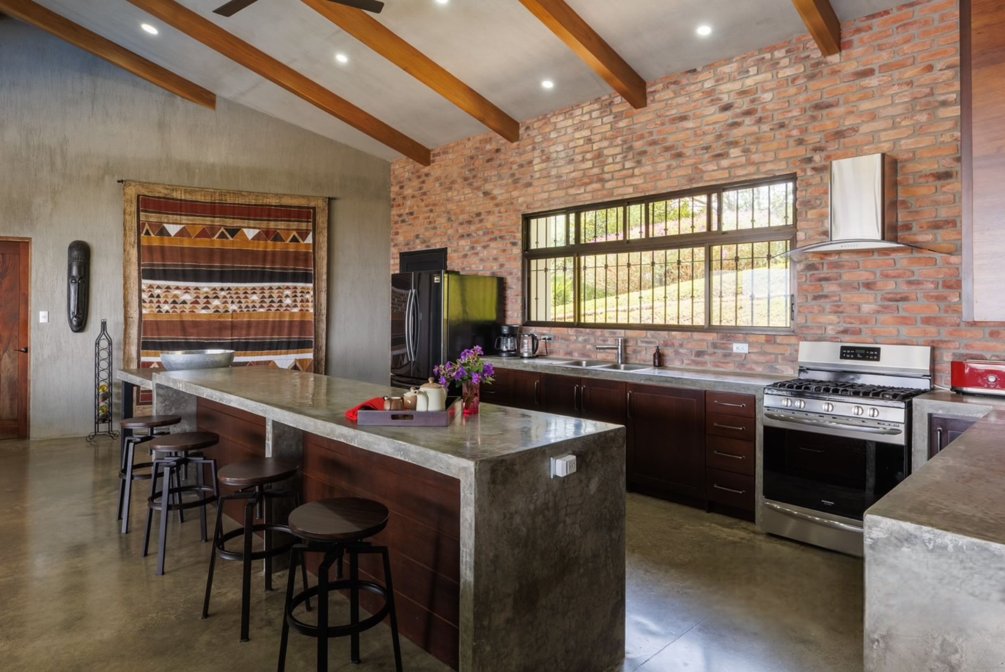 Built in 2018, the home blends clean architectural lines with warm, natural materials. High ceilings and an open-concept design create a spacious flow, while every room frames the captivating views. Polished concrete floors, solid wood cabinetry, and brick accents add an earthy elegance that echoes the landscape outside.